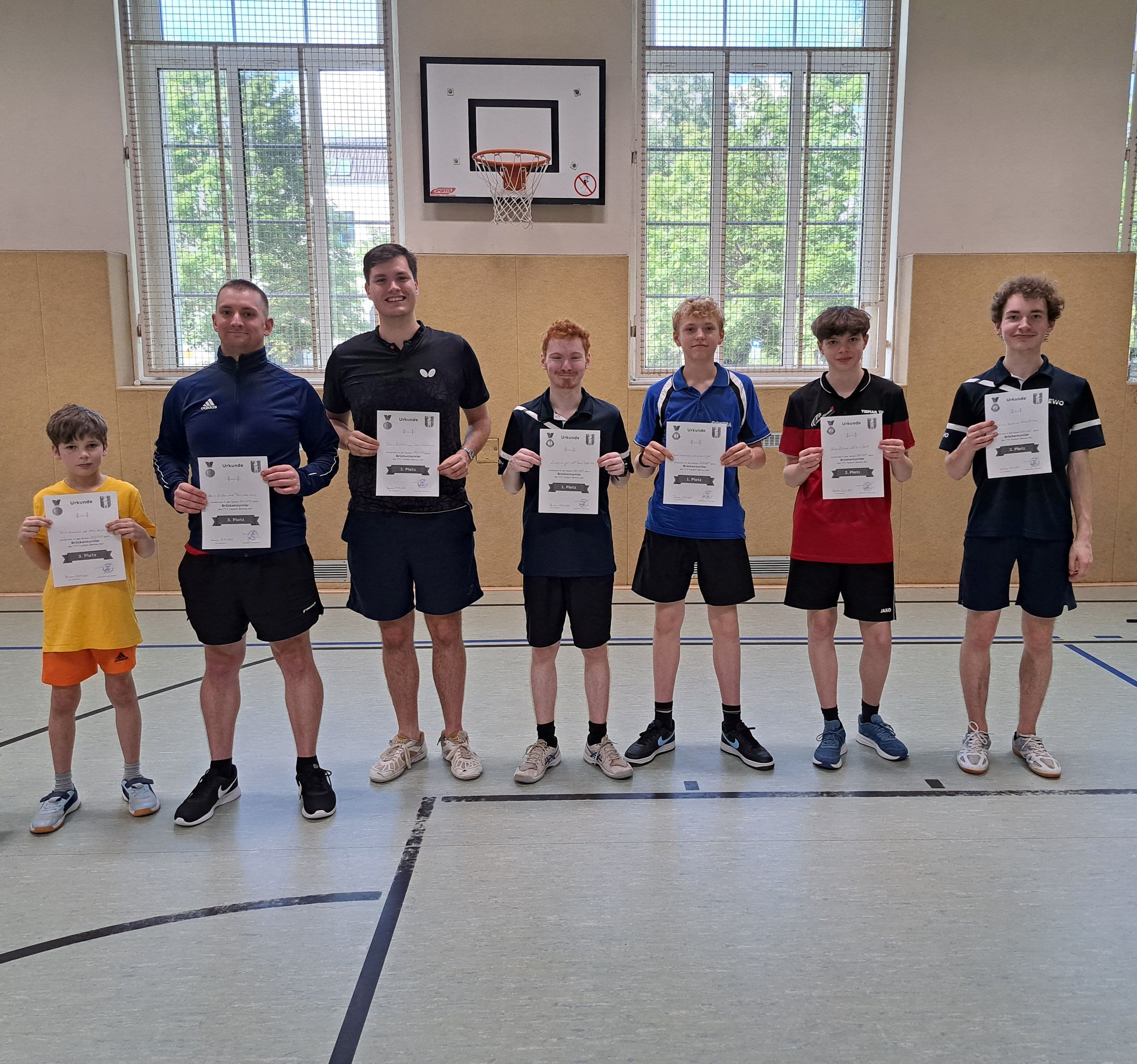 Auch in diesem Jahr organisierten unsere Trainer das traditionelle Brückenturnier. Dieses fand am 19.Juli 2025 mit insgesamt 14 Paarungen aus Erwachsenen- und Nachwuchsspielern statt. Diese wurden zusammengelost und spielten im Zweierteam gemeinsam zuerst in zwei 5er- und einer 4er-Gruppe um den Einzug in die K.O.-Runde. Im Anschluss konnten das Turnier Tobias Prippernau und Lucas Lieger vor Shane Wieland und Felix Beck gewinnen. Die dritten Plätze gingen an Linus Nitsche und Tobias Blättermann sowie an Felix Naumann und Marc Müller.