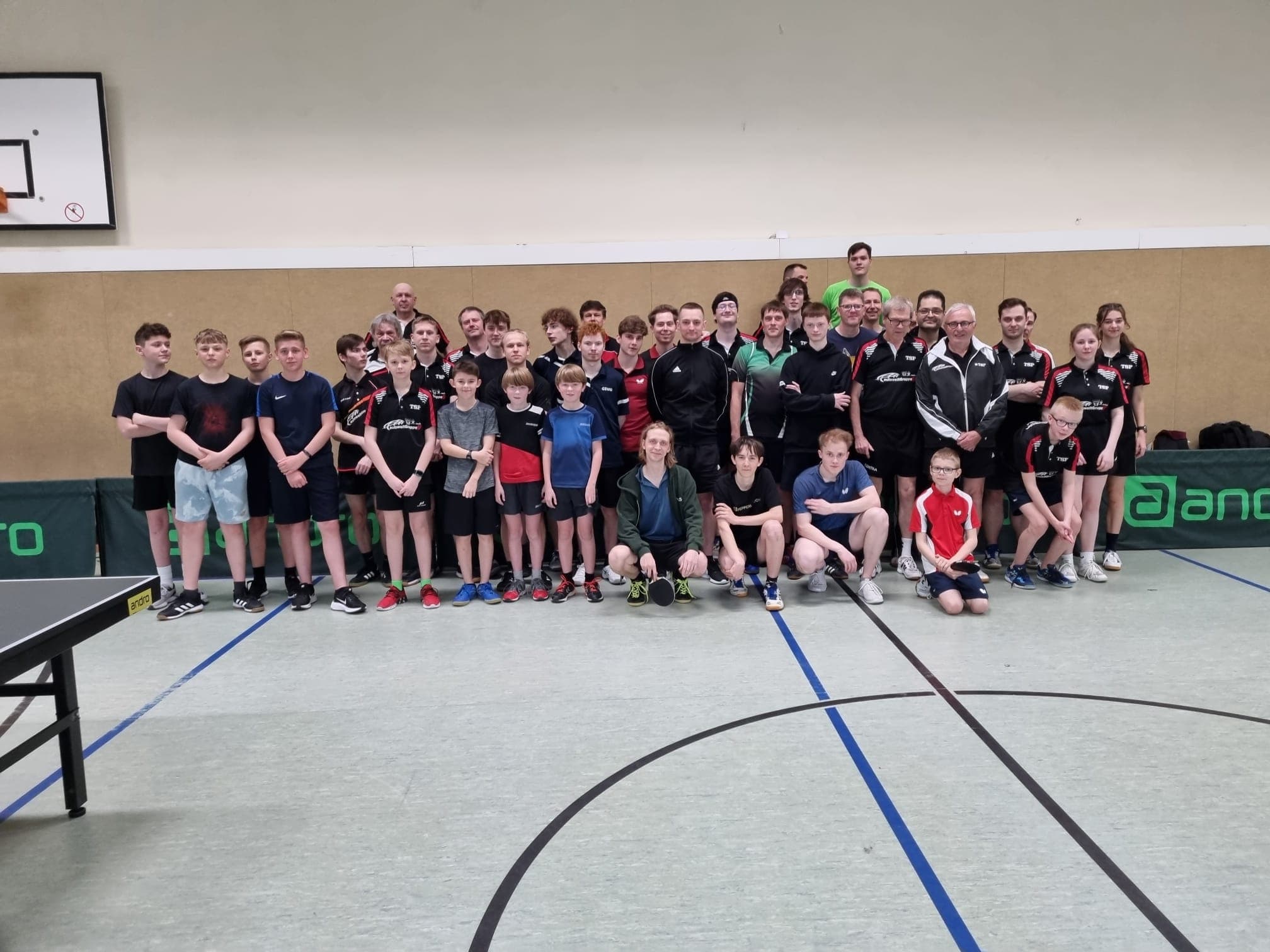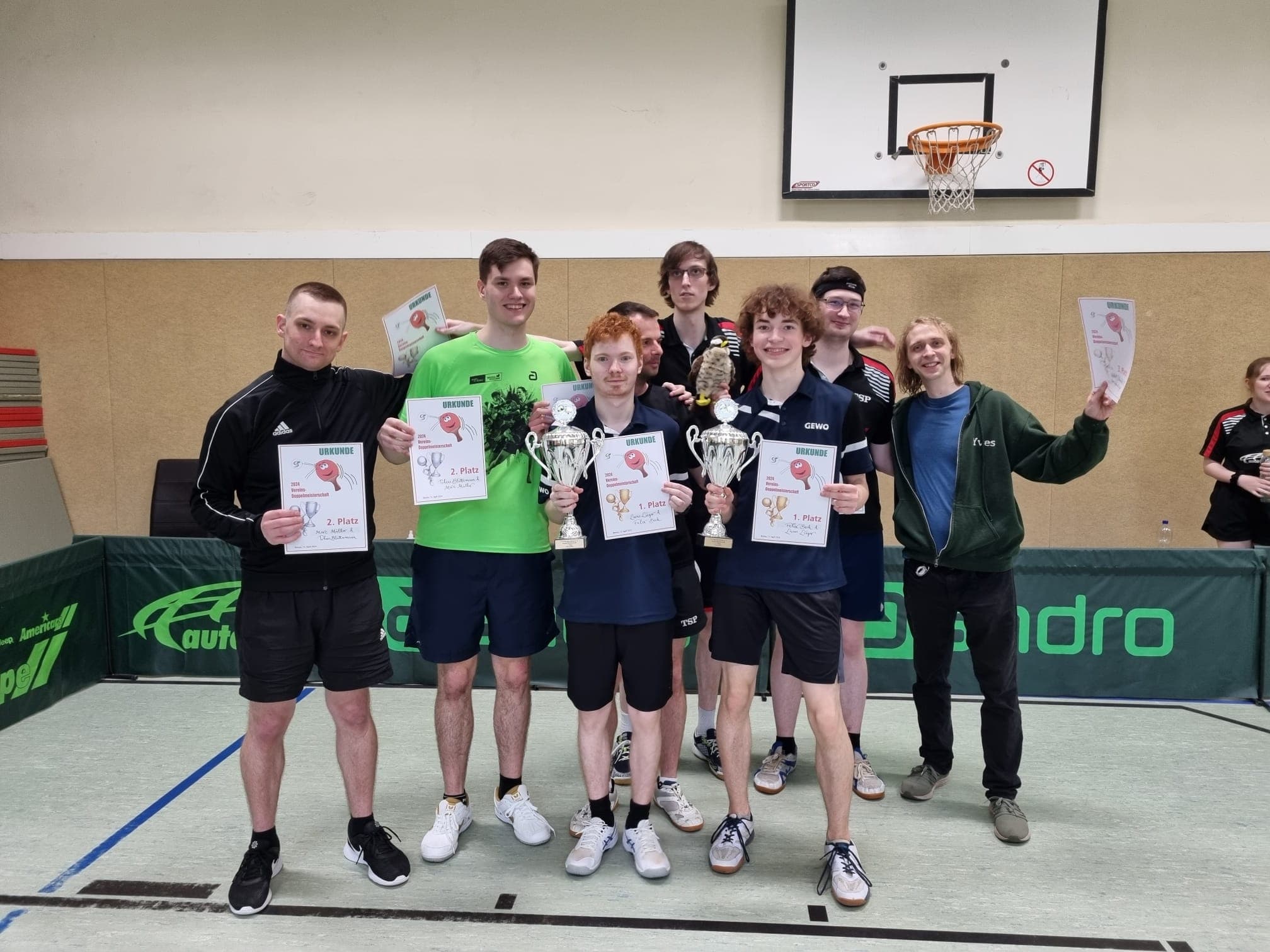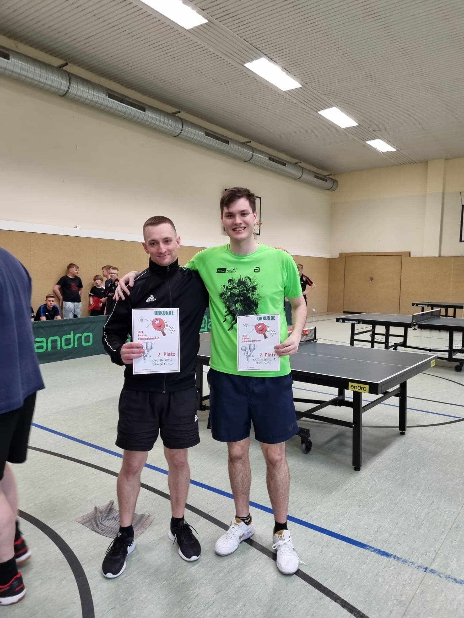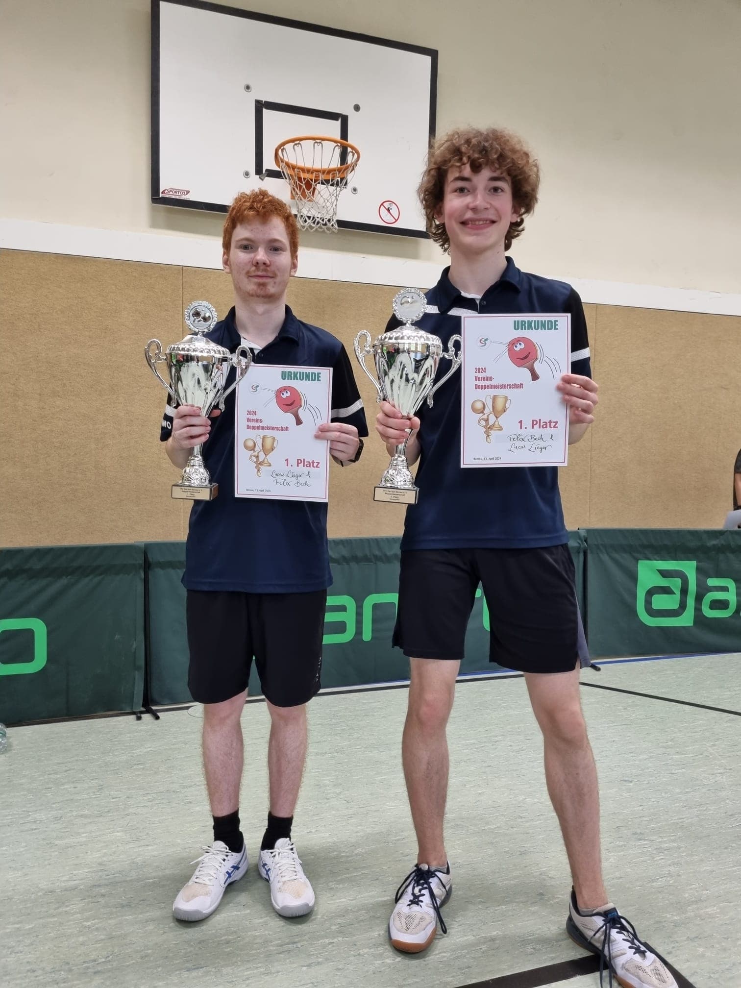 Am Anfang der Sommerpause fand unsere diesjährige Doppelvereinsmeisterschaft statt, welche nicht unerwähnt bleiben soll. Mit 20 Doppelpaaren gab es ein großen Teilnehmerfeld, welche zuerst in 4 Gruppen und danach im K.O.-System über Viertel-, Halb- und dem Finale die Titel ausspielten. Im Finale setzten sich die Favoriten Felix und Lucas gegen Tobias und Marc mit 3:1 durch. Die dritten Plätze gingen an Yves/Robert und Benjamin/Alwin🏆