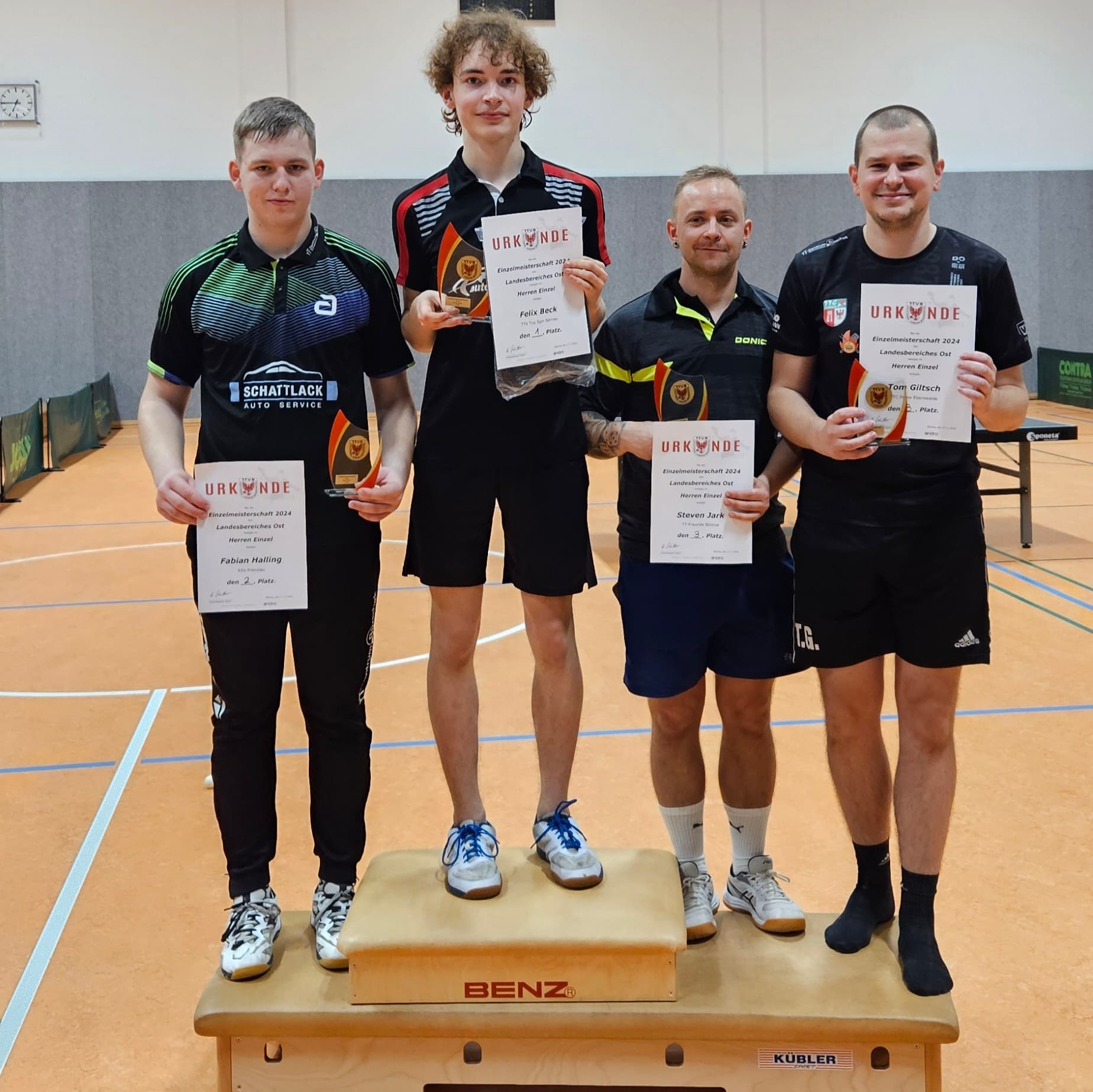 Und im Einzel konnten sich Lukas und Felix in der Gruppe und im Achtelfinale souverän durchsetzen. Lukas verlor dann leider sein Viertelfinale gegen Steven Jark (TT-Freunde Bötzow) mit 1:3, konnte aber dann im Platzierungsspiel den 5.Platz erreichen. Felix gewann dann sein Viertelfinale in einem harten Fight gegen Adrian Metzner (TTV Eisenhüttenstadt) mit 3:1, danach das Halbfinale gegen Tom Giltsch (TTC Finow) mit 3:2 und im Finale gegen Fabian Halling (ESV Prenzlau) mit 3:2 und wurde somit Landesbereichseinzelmeister🏆