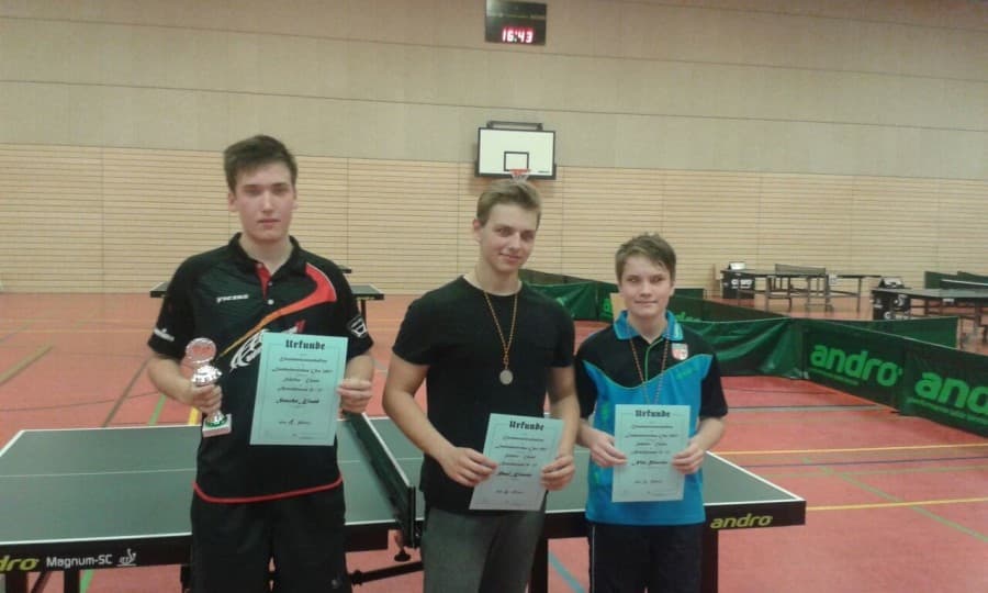 Sascha Kiank gewann bei den diesjährigen Landesbereichsmeisterschaften der Jungen am 5.11.2017 in Hohen Neuendorf zunächst seine Vorrunden-Gruppe und zog dadurch in die KO-Runde ein. Dank der gewonnenen Vorrunde hatte Sascha in der ersten Runde (Achtelfinale) ein Freilos. Im Viertel- und Halbfinale bezwang er seine Gegner jeweils 3:1 und stand nun im Finale. Hier musste er dann gegen Paul Krause antreten, der erst am Freitag für ESV Angermünde gegen unsere 3. Mannschaft spielte. Auch dieses Spiel konnte Sascha gewinnen und wurde somit bei den Jungen Landesbereichsmeister! Wahnsinn! Super! Glückwunsch!