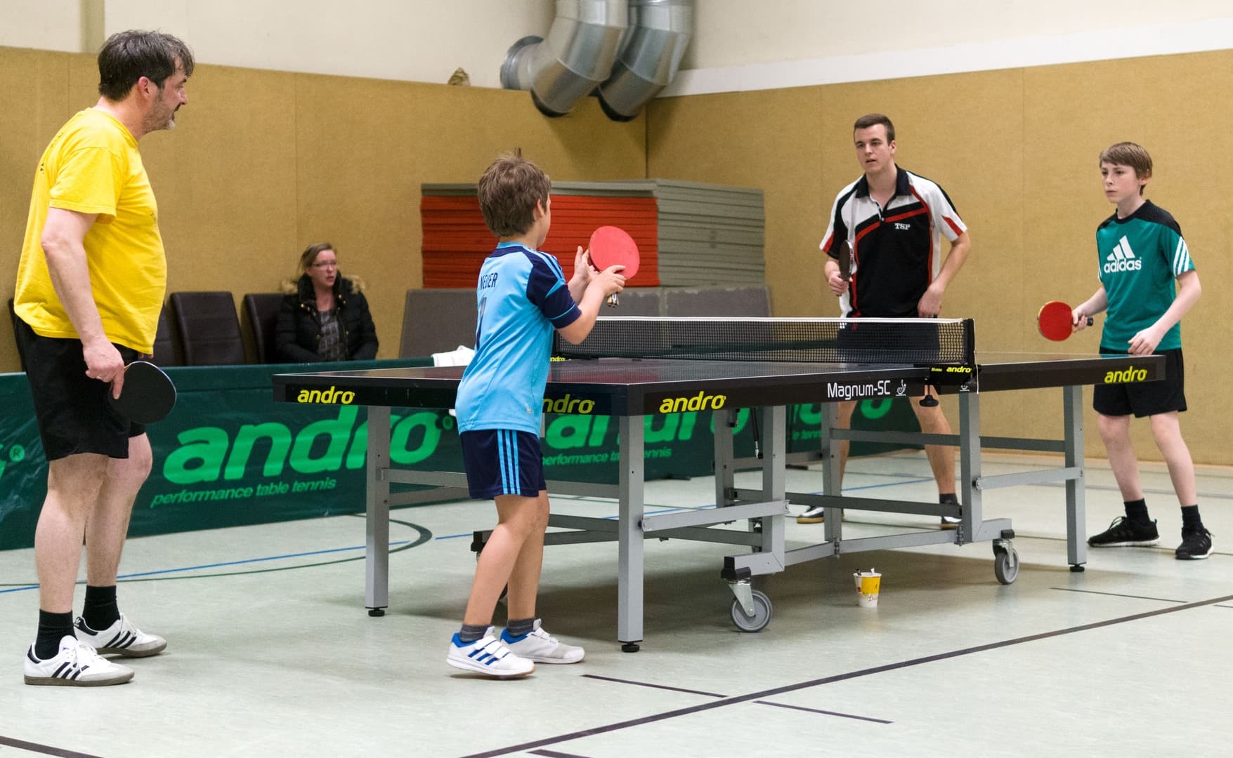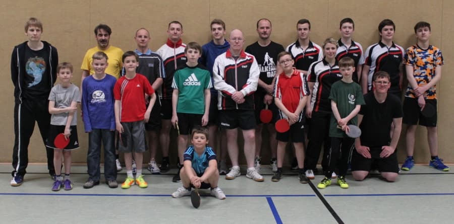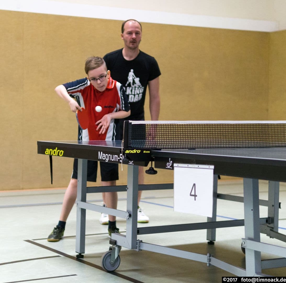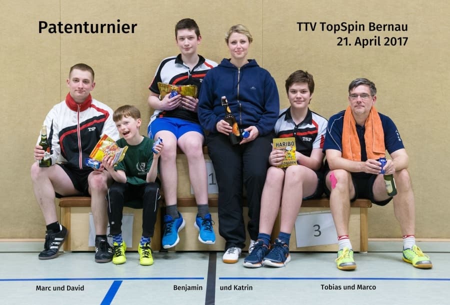 Am Freitag, dem 21.04.2017, fand unser diesjähriges Patenturnier statt. Bei diesem Zweiermannschaftsturnier spielte jeweils ein Vertreter des Erwachsenenbereichs mit einem Spieler des Nachwuchsbereichs. In diesem Jahr hatten wir eine gute Beteiligung von 20 Teilnehmern, aus denen per Los 10 Paare gebildet wurden. Diese traten zunächst in zwei Gruppen im System „Jeder gegen Jeden“ an. Daraufhin wurden die beiden obersten Paare jeder Gruppe in das einfache KO-System gezogen. Die Plätze 3-5 spielten gegen den jeweils Gleichplatzierten der anderen Gruppe um die untere Rangverteilung. Gespielt wurde durchgehend jeweils ein Doppel gefolgt von zwei Einzeln (Altersgruppen unter sich) mit jeweils zwei Gewinnsätzen.