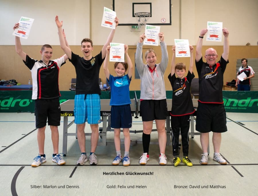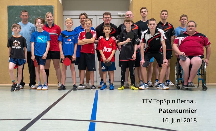 Das Trainerteam vom TTV TopSpin Bernau e.V. bedankt sich für die Beteiligung am Patenturnier, das am Samstag, den 16.06.2018 mit acht Zweier-Mannschaften stattgefunden hat. Die Teams, bestehend aus einem Erwachsenen und einem Nachwuchssportler, wurden mittels Los bestimmt. Es wurde zuerst in zwei Gruppen im Modus "Jeder gegen Jeden" gespielt. Anschließend zogen die ersten beiden jeder Gruppe in das KO-System ein, um den Sieger zu ermitteln. Die Dritt- und Viertplatzierten der beiden Gruppen spielten jeweils unter sich die bessere Platzierung aus.
