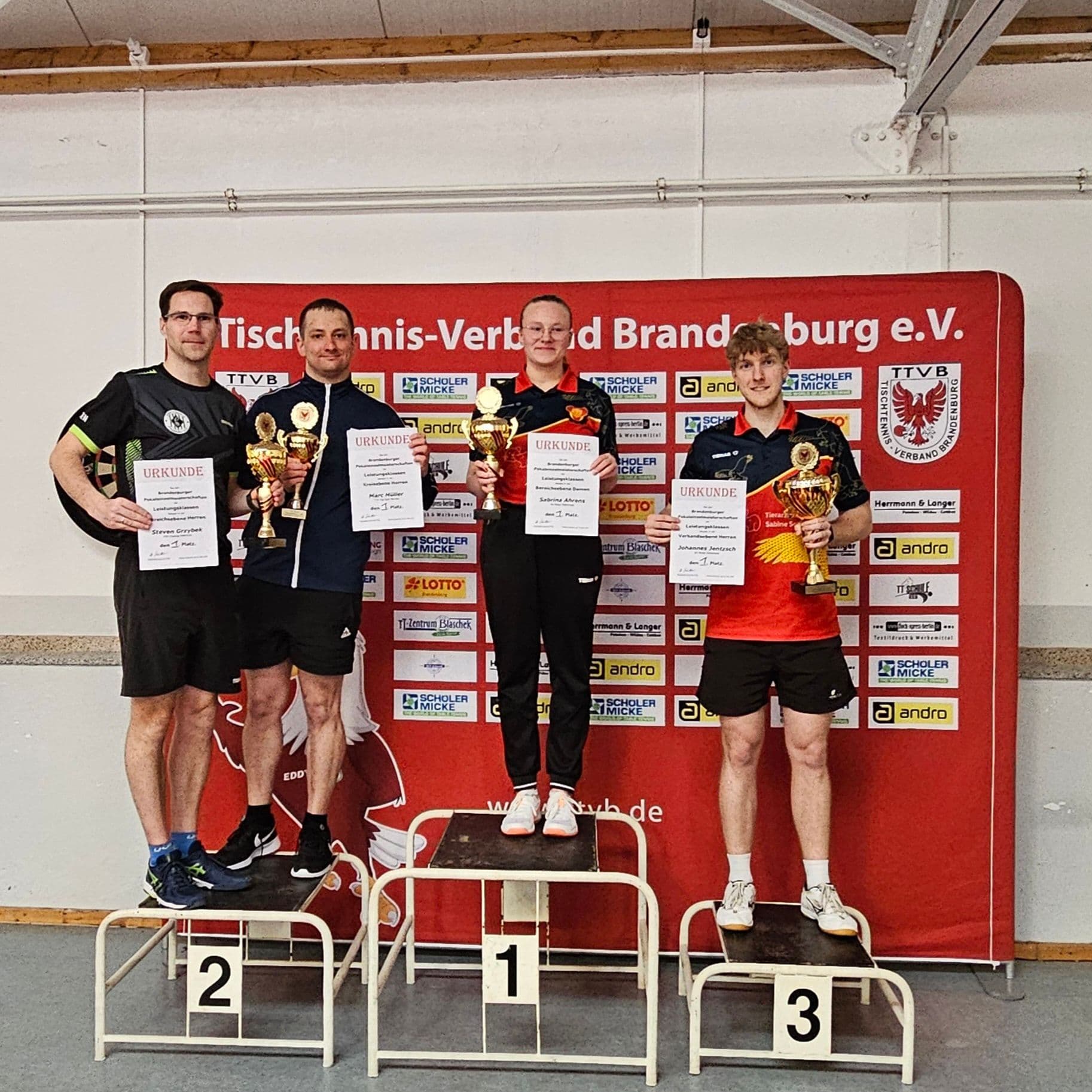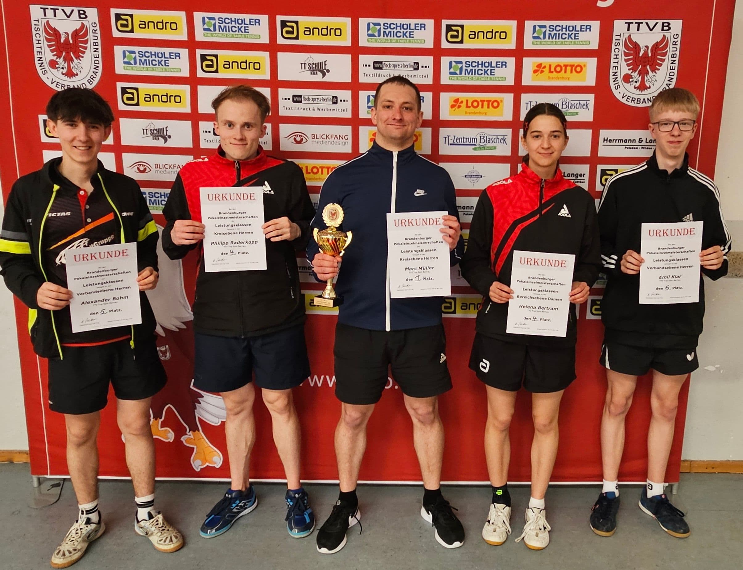 Am 29.03.2026 fand die brandenburgische Endrunde der Pokaleinzelmeisterschaften in Märkisch-Buchholz (Dahme-Spreewald) statt. Mit Alex und Emil bei den Herren A (QTTR bis 2000), Helena bei den Damen B (QTTR bis 1500) und Philip und Marc bei den Herren C (QTTR bis 1600) hatten wir insgesamt 5 Spieler von unserem Verein.