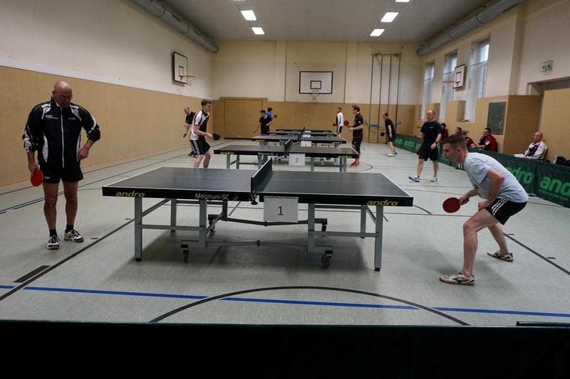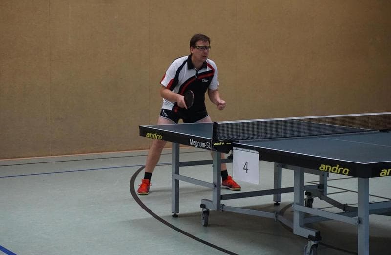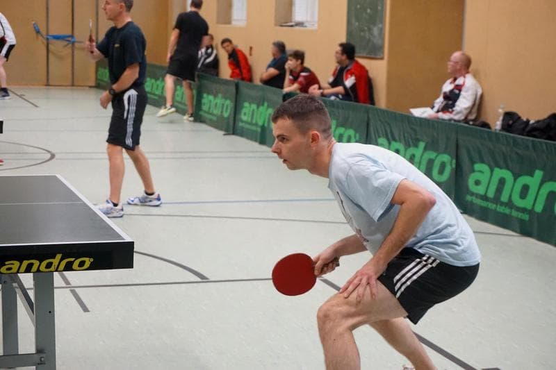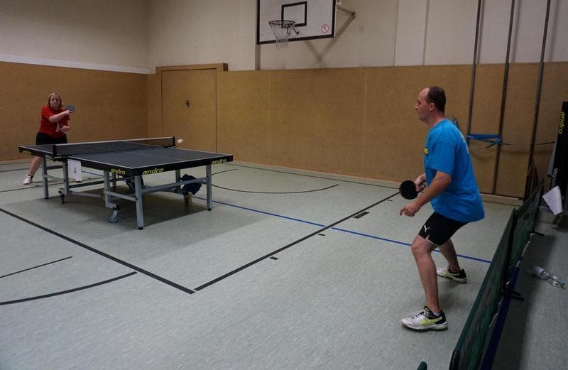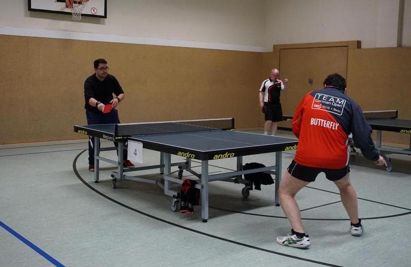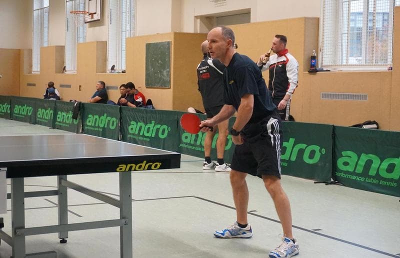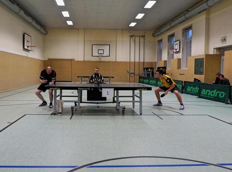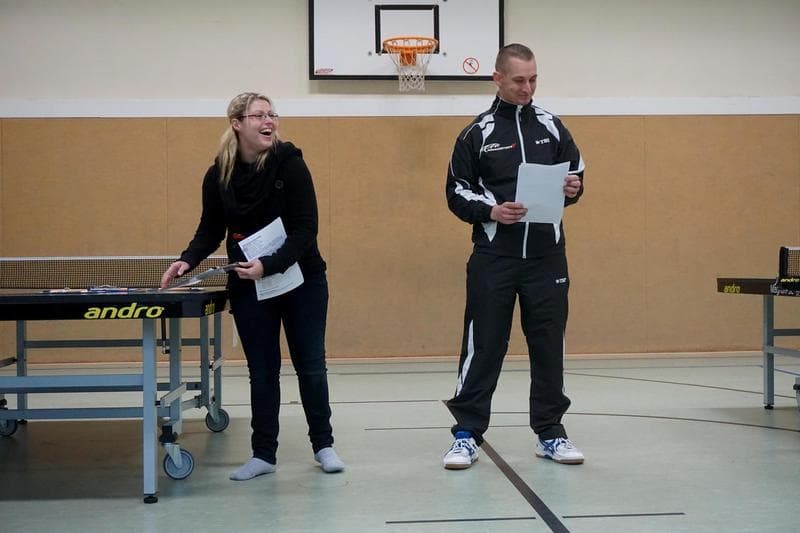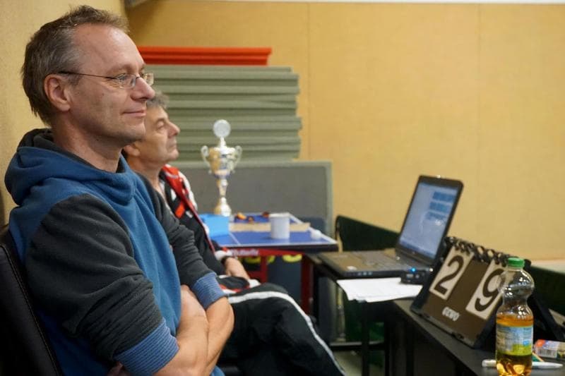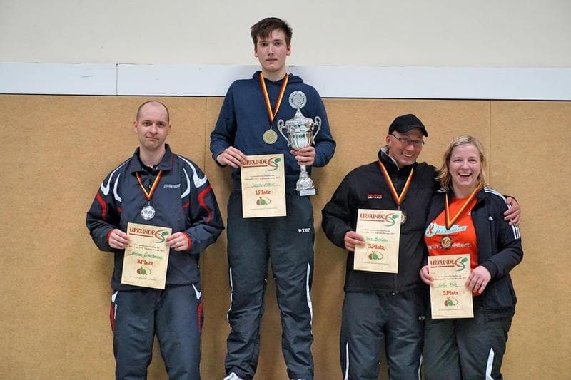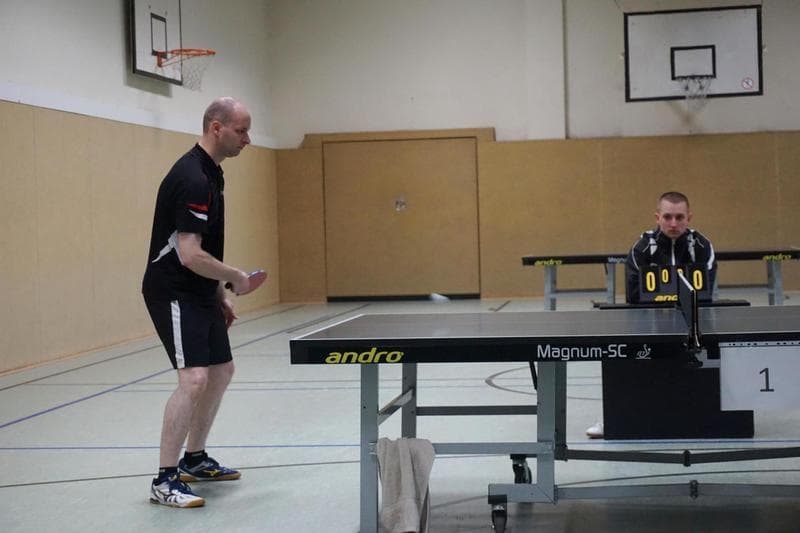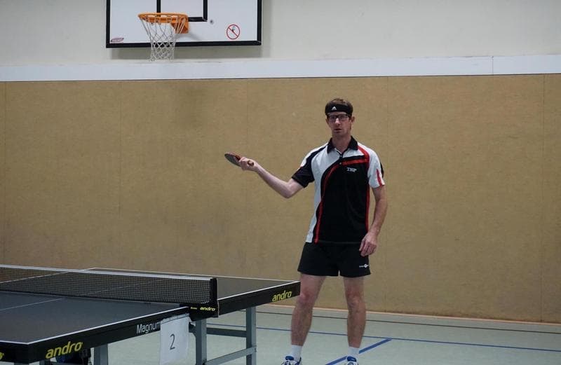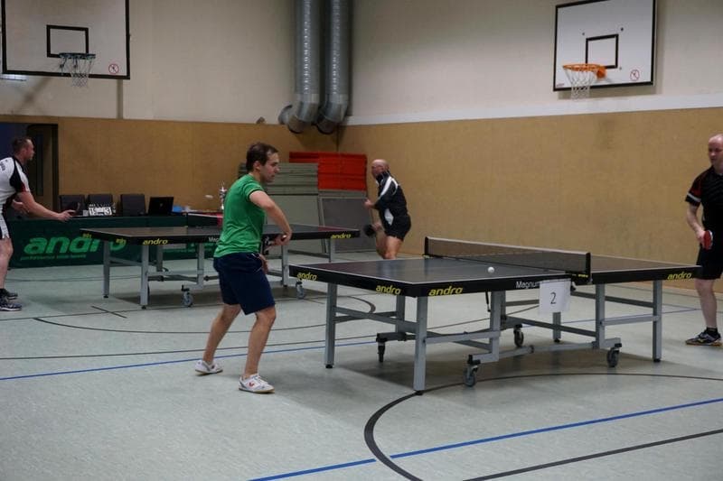 Die 4 Viertelfinalspiele gingen dann alle recht deutlich aus. Im Duell der 1.Mannschaft gewann Sascha Ki. gegen Marc, im Duell der 2.Mannschaft Jens gegen Alex, Andreas gewann gegen Fabian und Helen siegte gegen Steve. Somit spielten Sascha Ki, Jens, Andreas und Helen die Podestplatzierungen aus. Im ersten Halbfinale spielte Sascha gegen Jens. Dabei gewann Sascha die ersten beiden Sätze souverän und lies schon vermuten, dass er das Match deutlich gewinnen wird. Doch dann zeigte Jens sein können, gewann den 3.Satz und konnte den 4.Satz nach 4:9 und 7:10 noch 12:10 gewinnen. Der letzte Satz war nochmal sehr umkämpft, wurde dann aber doch von Sascha gewonnen, der damit ins Finale einzog. Im anderen Halbfinale spielten Helen und Andreas um das zweite Finalticket. Hier setze sich in drei knappen Sätzen Andreas durch. Damit erreichten Jens und Helen den 3.Platz.