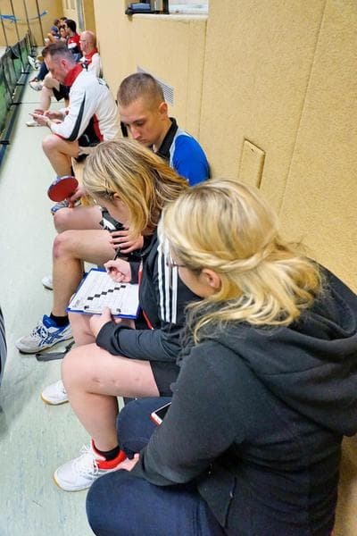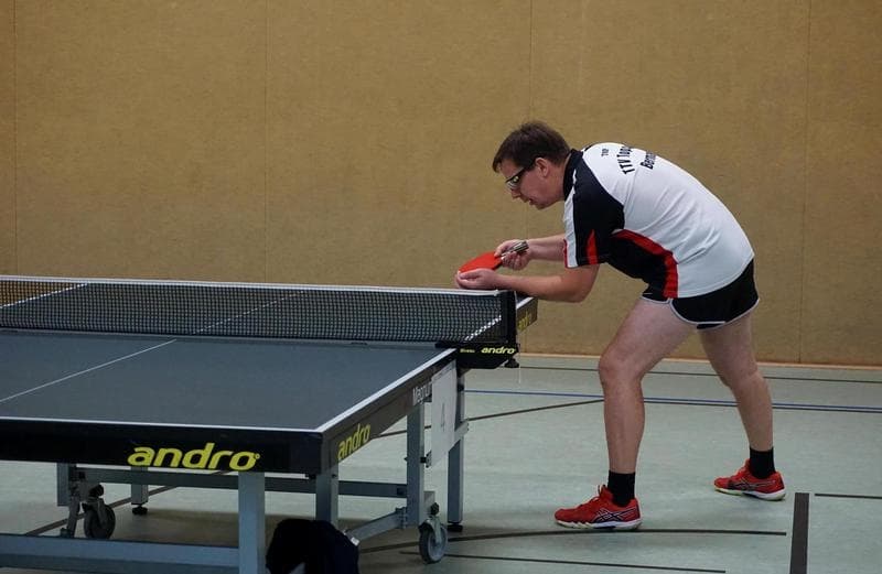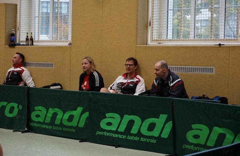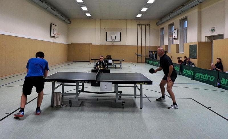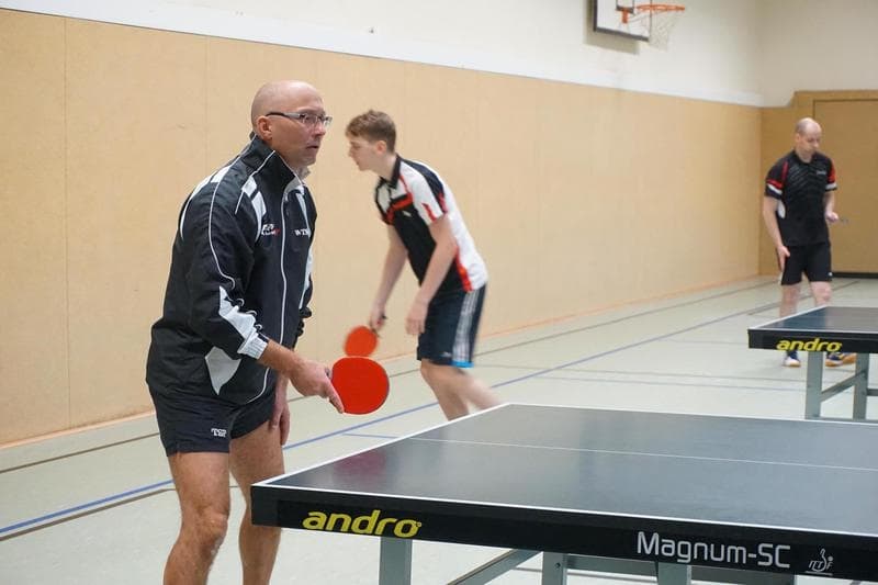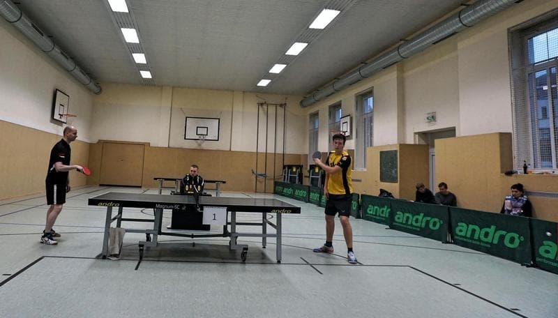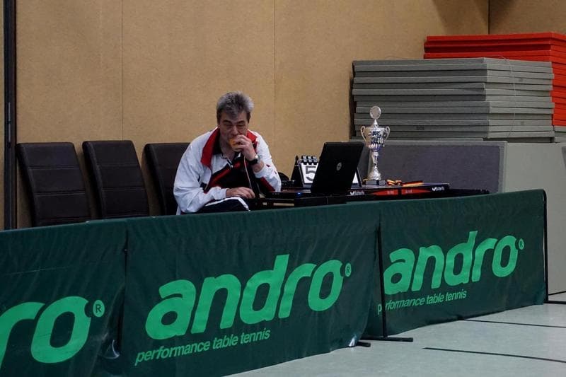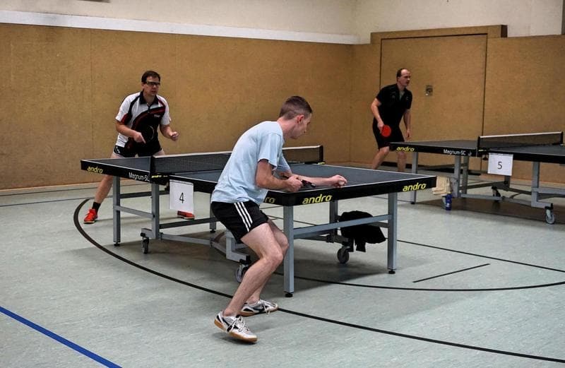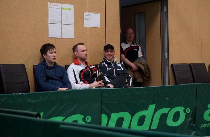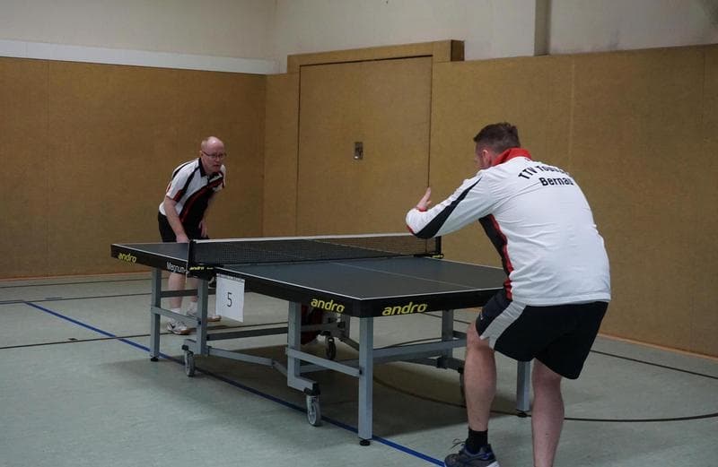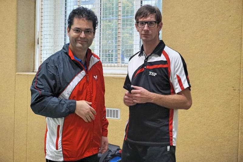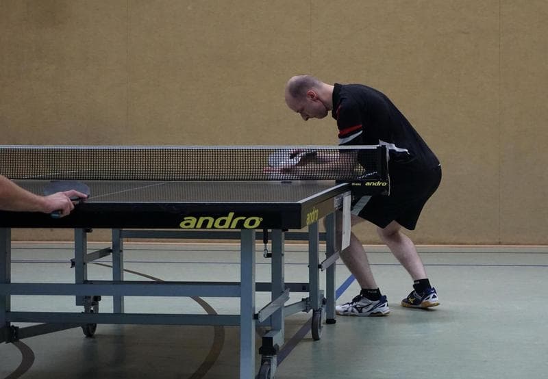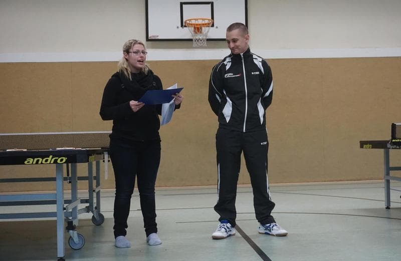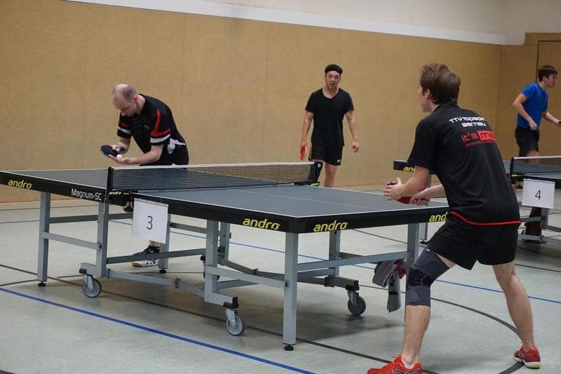 Die 4 Viertelfinalspiele gingen dann alle recht deutlich aus. Im Duell der 1.Mannschaft gewann Sascha Ki. gegen Marc, im Duell der 2.Mannschaft Jens gegen Alex, Andreas gewann gegen Fabian und Helen siegte gegen Steve. Somit spielten Sascha Ki, Jens, Andreas und Helen die Podestplatzierungen aus. Im ersten Halbfinale spielte Sascha gegen Jens. Dabei gewann Sascha die ersten beiden Sätze souverän und lies schon vermuten, dass er das Match deutlich gewinnen wird. Doch dann zeigte Jens sein können, gewann den 3.Satz und konnte den 4.Satz nach 4:9 und 7:10 noch 12:10 gewinnen. Der letzte Satz war nochmal sehr umkämpft, wurde dann aber doch von Sascha gewonnen, der damit ins Finale einzog. Im anderen Halbfinale spielten Helen und Andreas um das zweite Finalticket. Hier setze sich in drei knappen Sätzen Andreas durch. Damit erreichten Jens und Helen den 3.Platz.