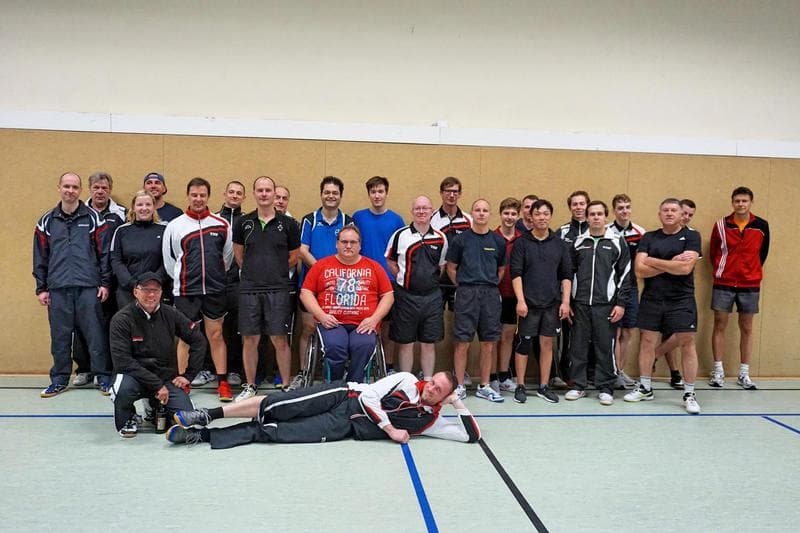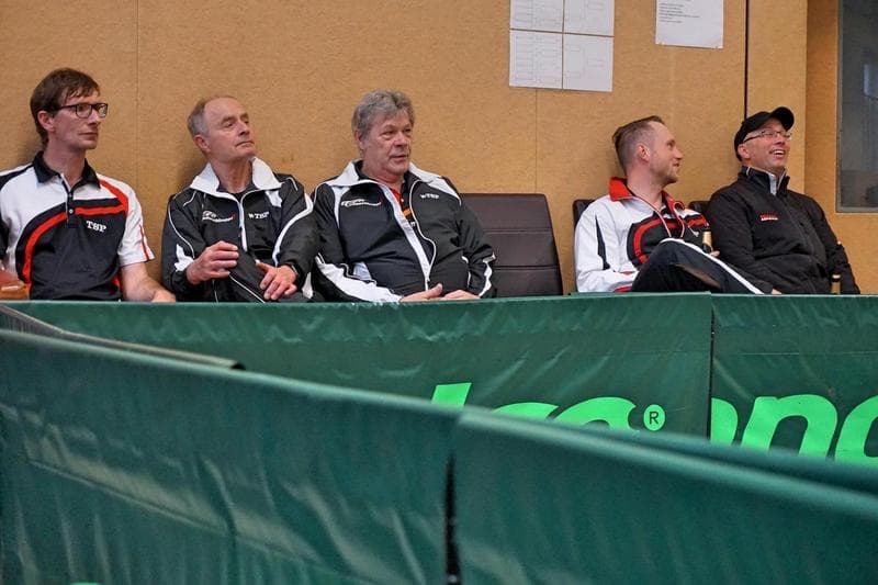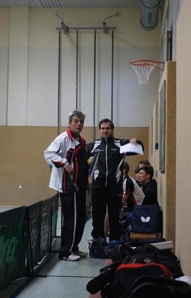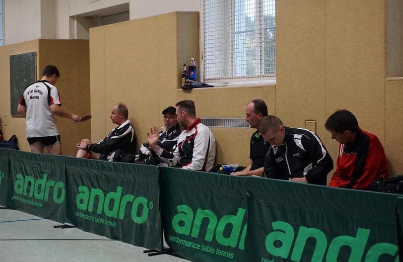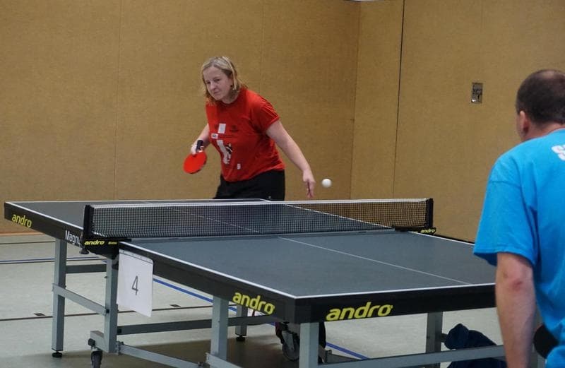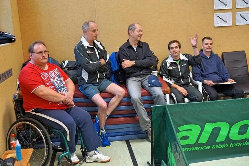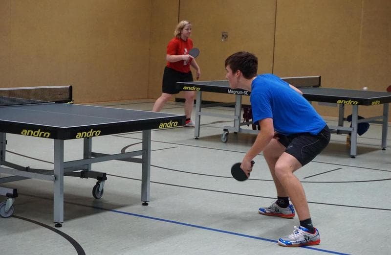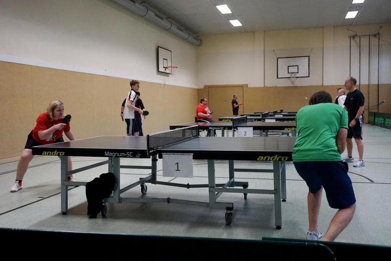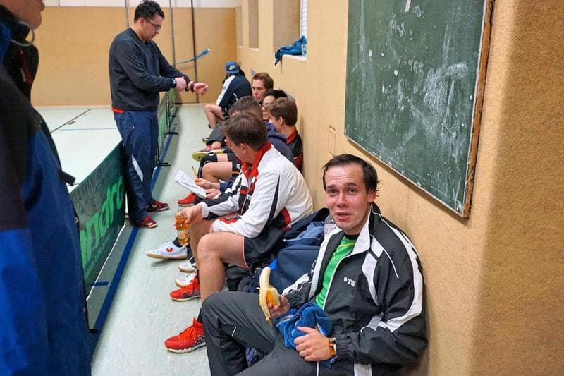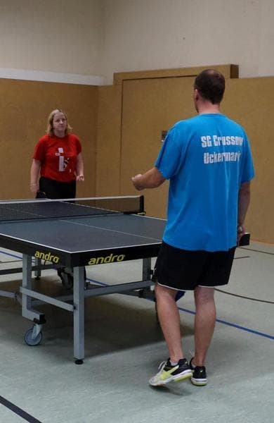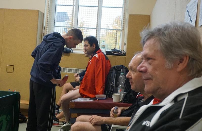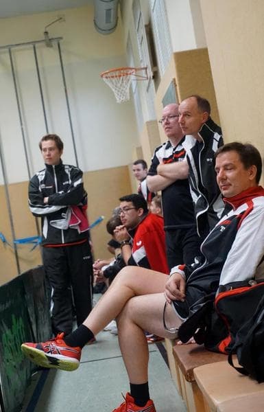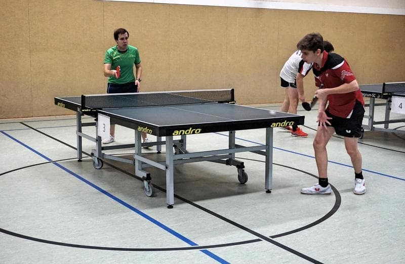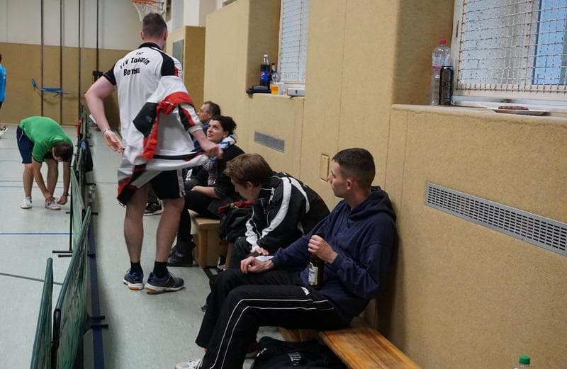 Die 4 Viertelfinalspiele gingen dann alle recht deutlich aus. Im Duell der 1.Mannschaft gewann Sascha Ki. gegen Marc, im Duell der 2.Mannschaft Jens gegen Alex, Andreas gewann gegen Fabian und Helen siegte gegen Steve. Somit spielten Sascha Ki, Jens, Andreas und Helen die Podestplatzierungen aus. Im ersten Halbfinale spielte Sascha gegen Jens. Dabei gewann Sascha die ersten beiden Sätze souverän und lies schon vermuten, dass er das Match deutlich gewinnen wird. Doch dann zeigte Jens sein können, gewann den 3.Satz und konnte den 4.Satz nach 4:9 und 7:10 noch 12:10 gewinnen. Der letzte Satz war nochmal sehr umkämpft, wurde dann aber doch von Sascha gewonnen, der damit ins Finale einzog. Im anderen Halbfinale spielten Helen und Andreas um das zweite Finalticket. Hier setze sich in drei knappen Sätzen Andreas durch. Damit erreichten Jens und Helen den 3.Platz.