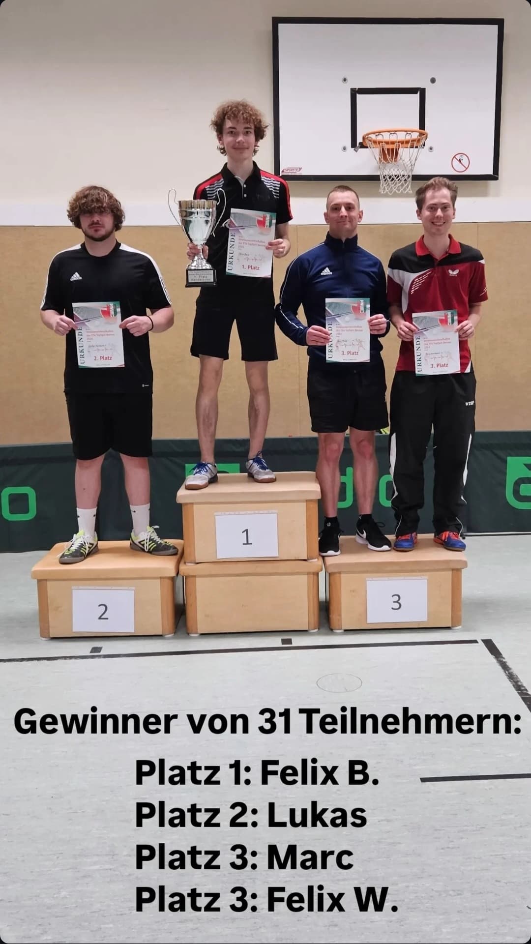 Am Wochenende fanden unsere diesjährigen Vereinsmeisterschaften statt. Bei den Erwachsenen nahmen 31 Spieler daran teil. Eingeteil in 6 5er- und 6er-Gruppen, schafften die besten 16 den Sprung in die K.O.-Runde. Felix B., Lukas, Marc und Felix W. schafften es dann bis ins Halbfinale. Hier konnte sich Felix B. mit 3:0 gegen Felix W. und Lukas mit 3:2 gegen Marc durchsetzten. Im anschließenden Finale konnte Felix B. gegen Lukas mit 14:12 im 5.Satz gewinnen und wurde somit erstmalig Vereinsmeister🏓