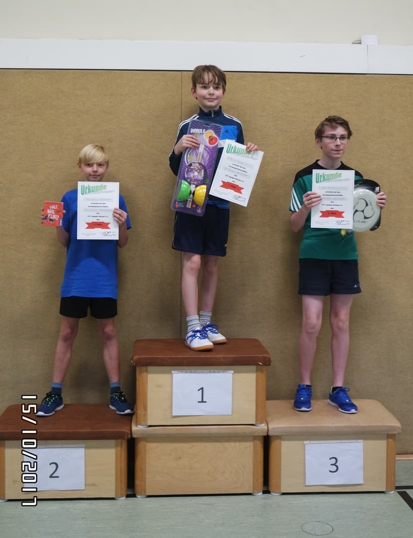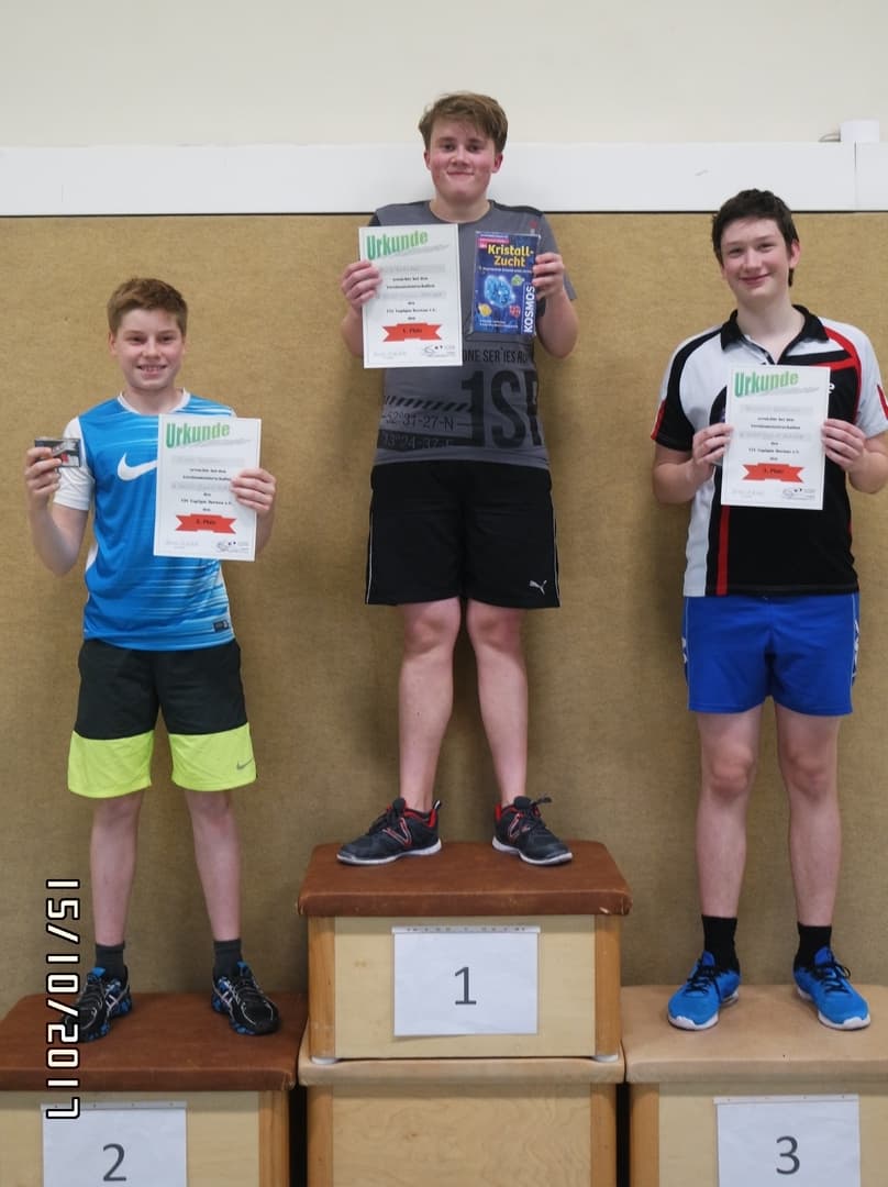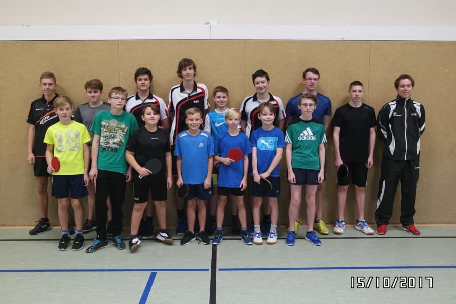 Das Turnier unserer jungen Sportfreunde hat erfolgreich am Sonntag, den 15. Oktober 2017stattgefunden. Mit einer Beteiligung von 15 Sportlern wurde in zwei Altersklassen um den Titel des Vereinsmeisters gespielt. In der Altersklasse B-Schüler wurde in einer Gruppe "Jeder gegen jeden" die Platzierung ausgespielt. In der Gruppe A-Schüler + Jugend wurde zuerst eine Gruppenphase mit anschließendem einfachen K.O.-System ausgetragen.